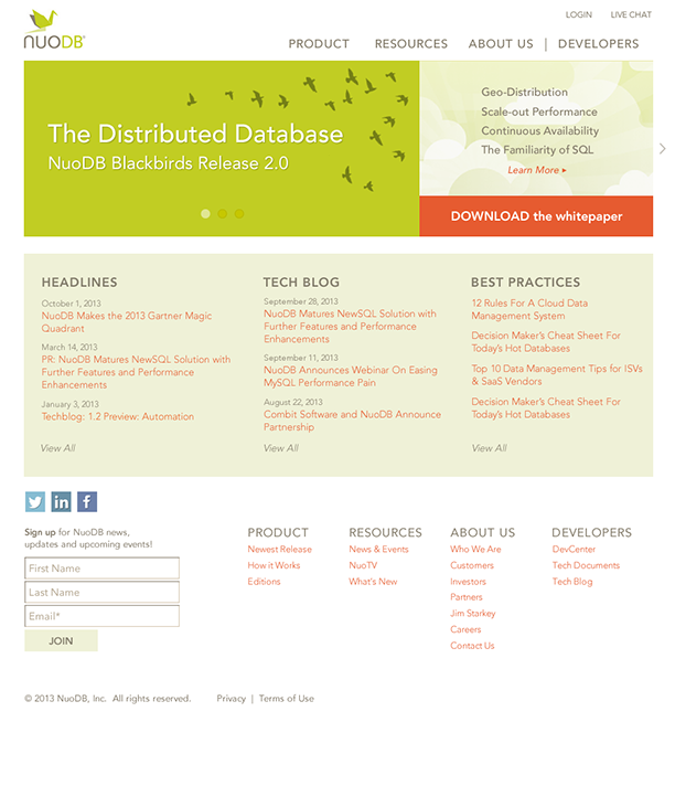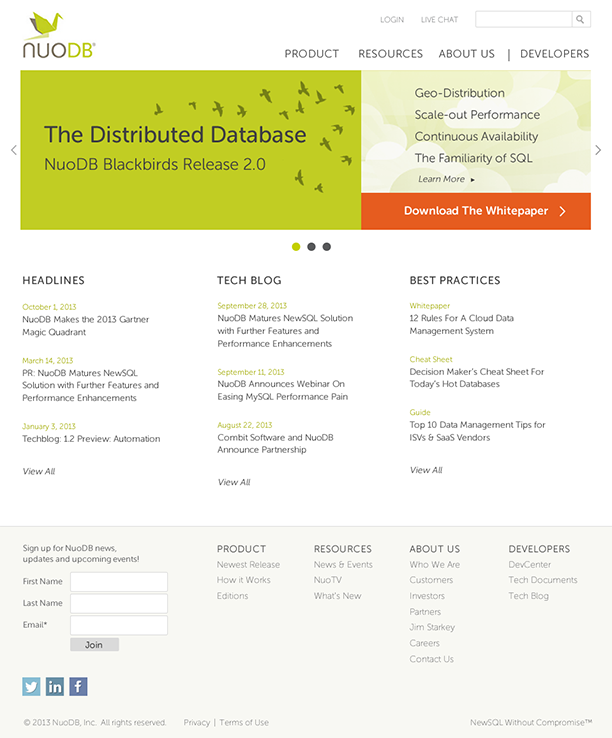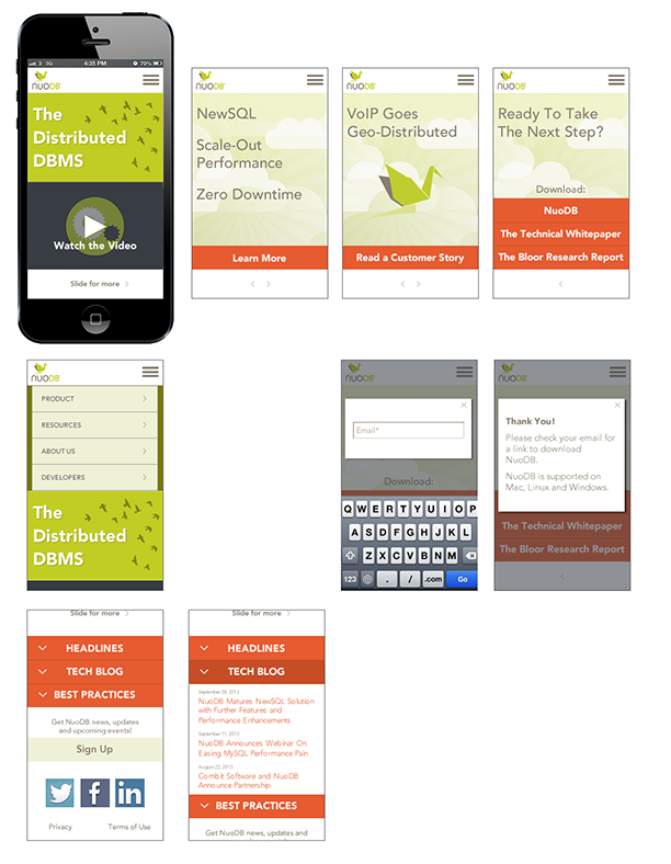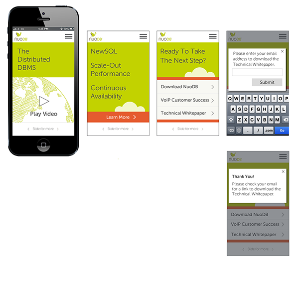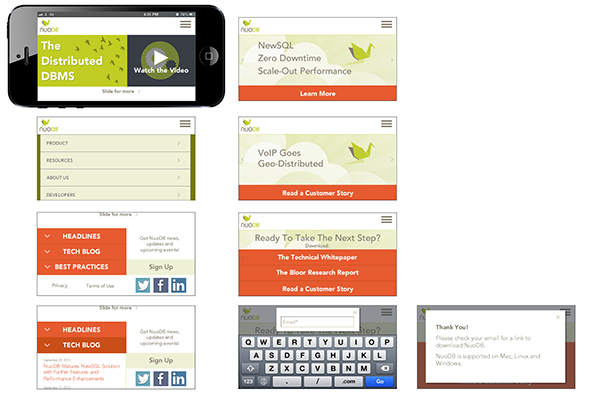 Before coming to us, NuoDB had an independant company do some UX testing of their site. The test showed that the site wasn't capitalizing on NuoDB's strengths in distributed database development, the nav sections, particularly in mobile, needed to be simpler, more subdued, less distracting, and they needed more appropriate CTAs for mobile users. They wanted to be sure that the user could easily figure out what to do. They needed to get user information before they left the site. They decided that a separate mobile version was needed. They also wanted a more "Apple, Inc." feel. This was translated to mean a more open, clean, and flatter design.